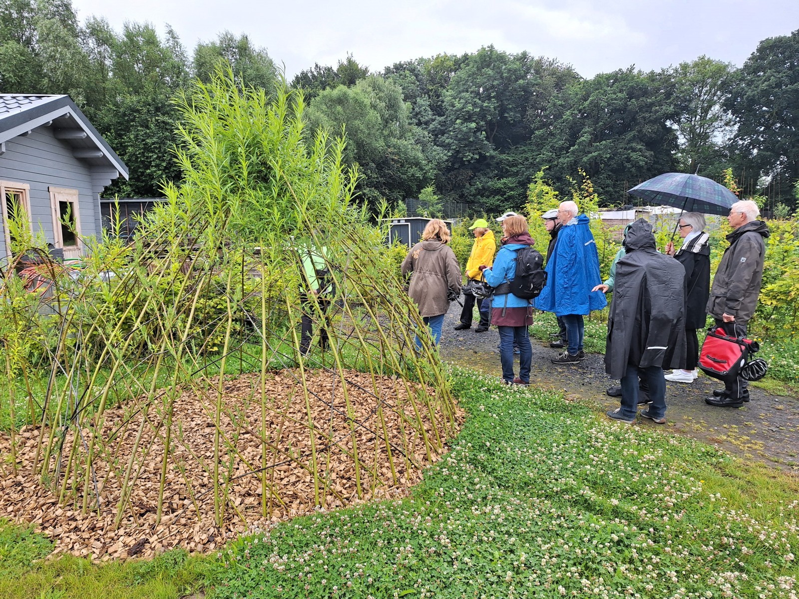 Die Schriftführerin des Vereins, Ruth Hentschel, führte die Gruppe durch die Anlage und beantwortete bereitwillig alle Fragen. Die meisten Teilnehmer waren über die Presseveröffentlichungen informiert und zeigten sich beindruckt, was trotz der fehlenden Strom- und Wasserversorgung bereits entstanden war. Mit Lob für die bereits erfolgreich umgesetzten Projekte (Insekten-Hotel, Spielplatz, Weiden-Tipi) wurde nicht gespart und es wurde eifrig fotografiert.